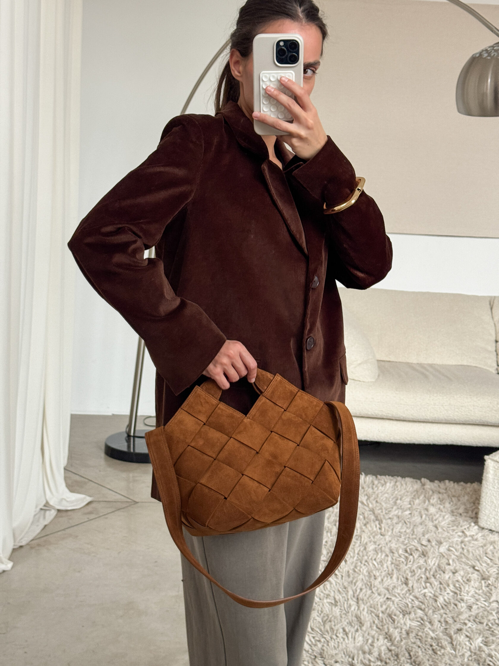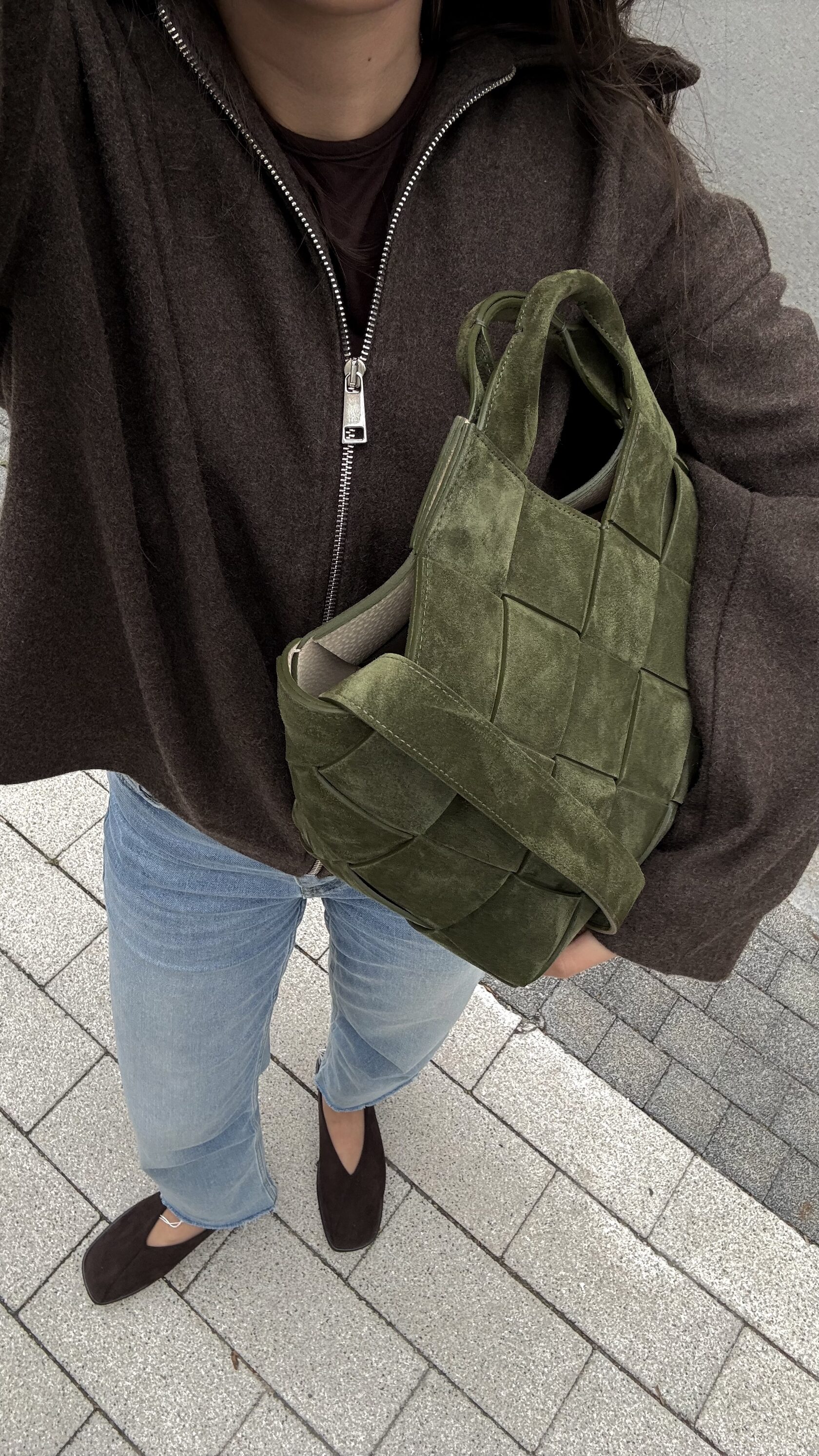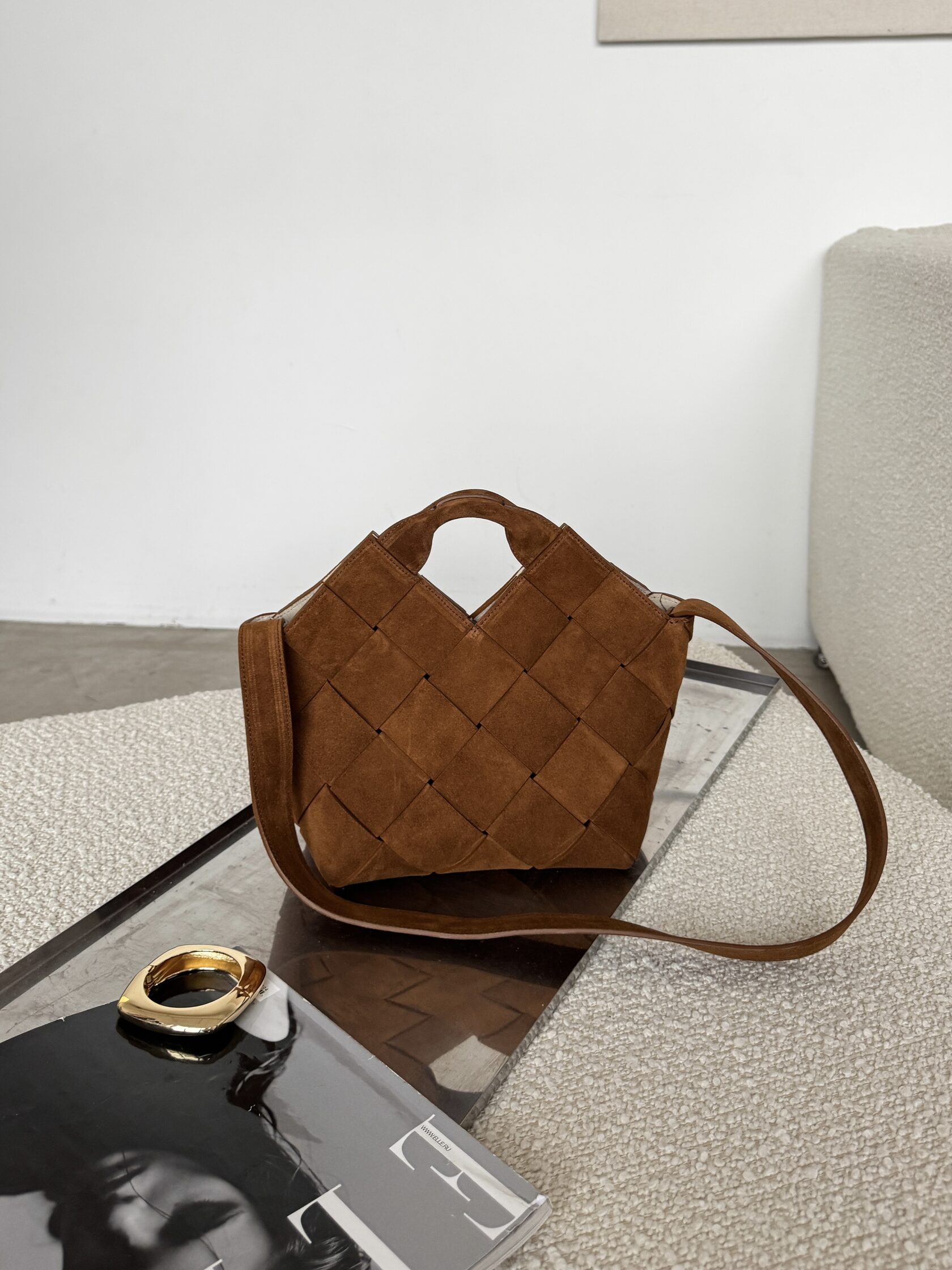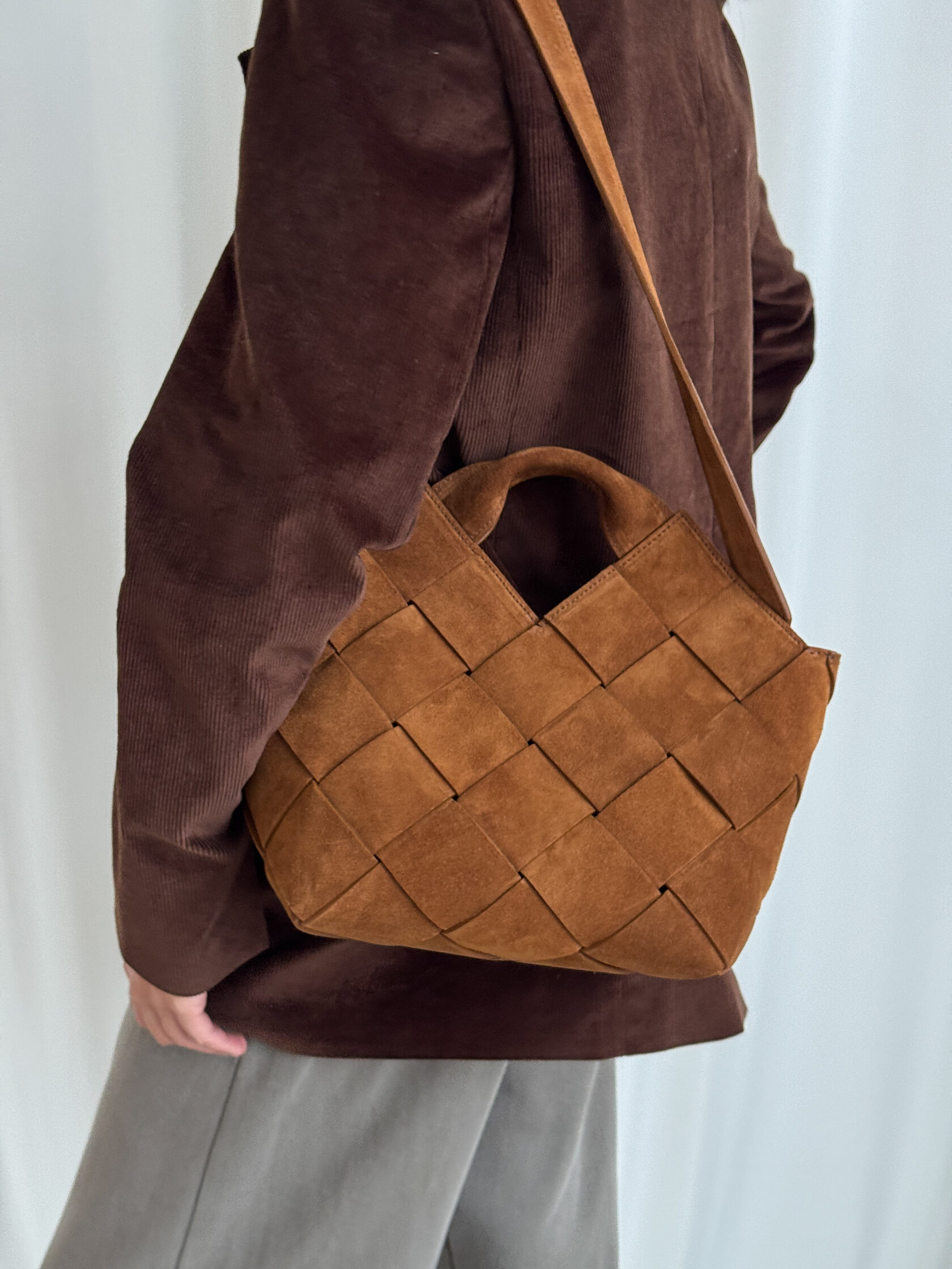 Сумка-корзина в технике ручного плетения из натуральной замши. Закрывается на скрытые магниты, внутри отделение с отделкой подкладочной кожей, в комплекте съемный плечевой ремень.