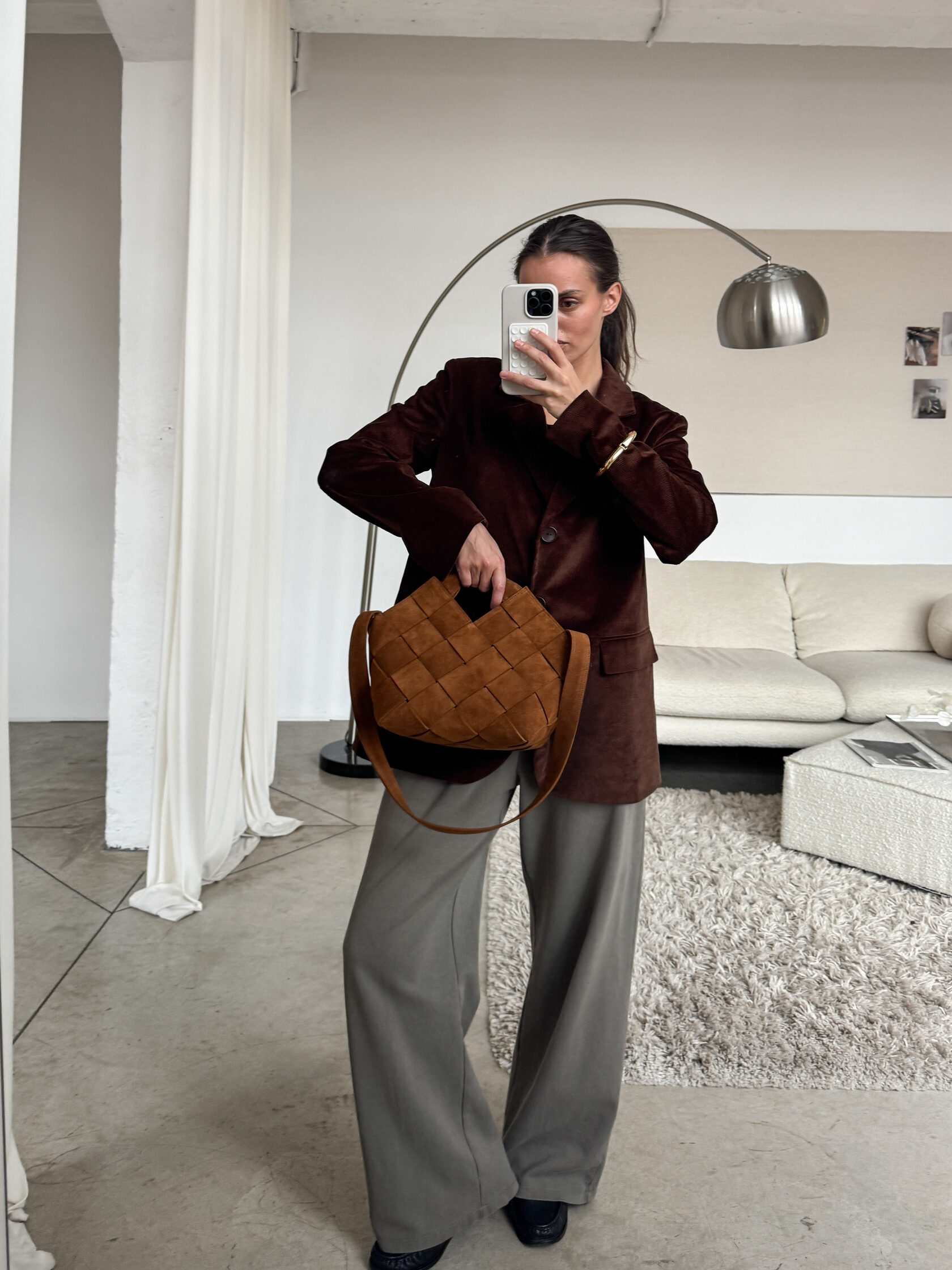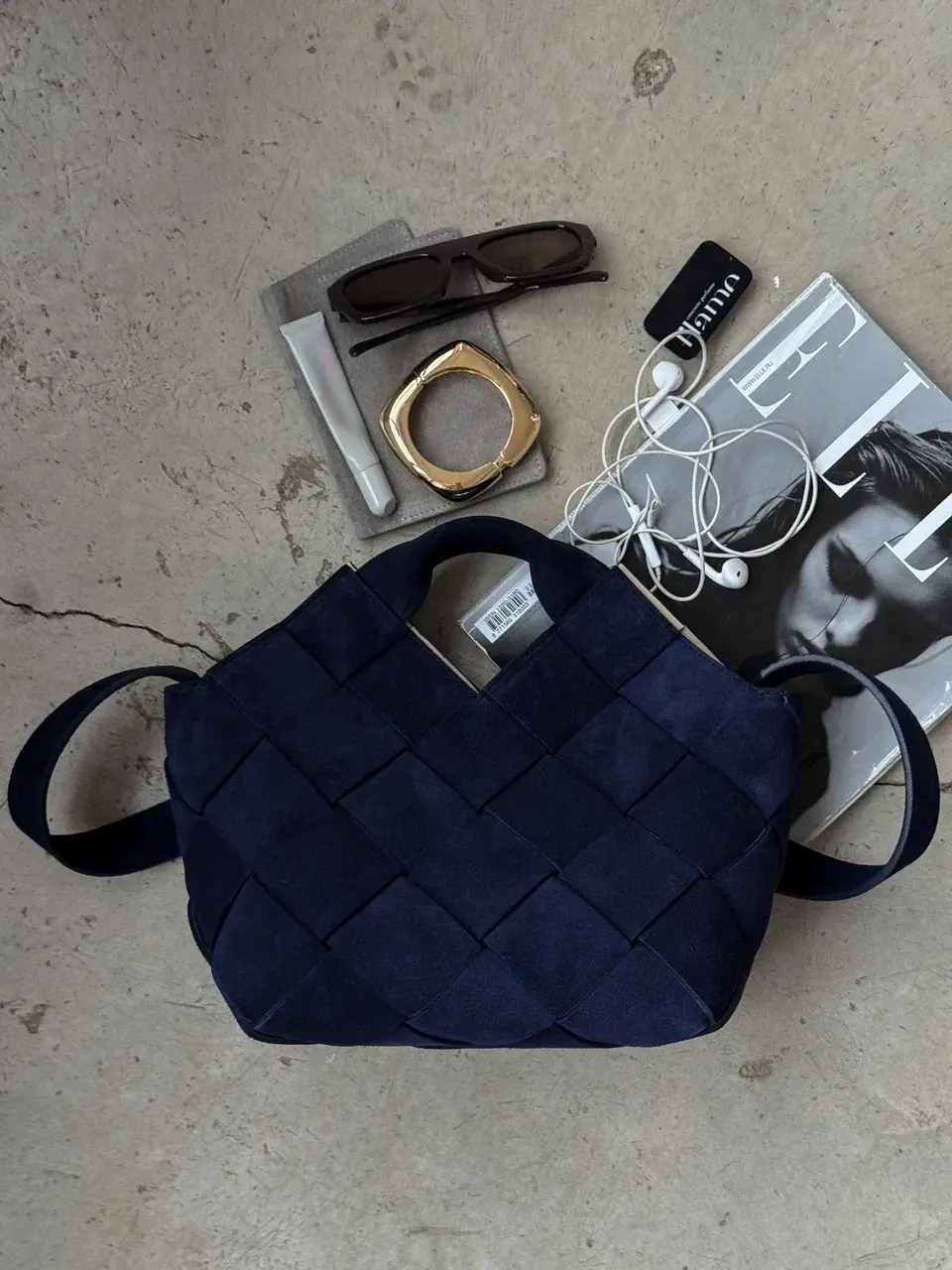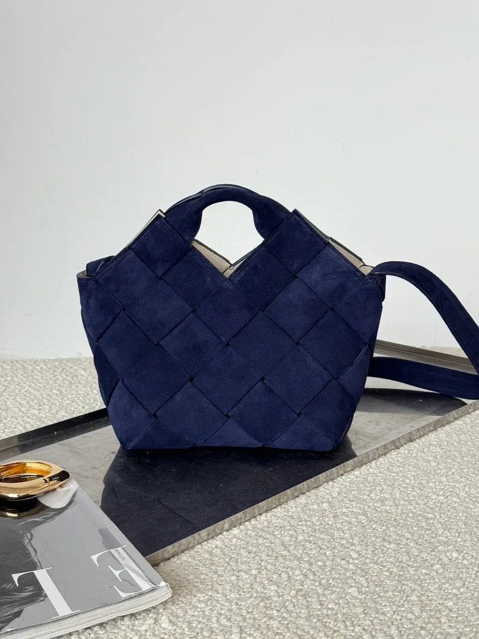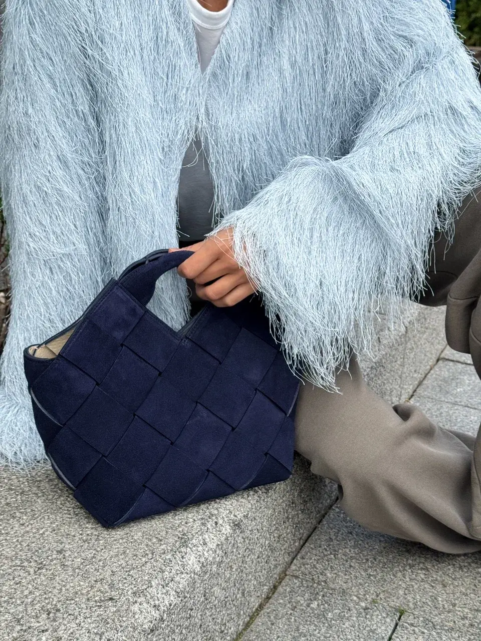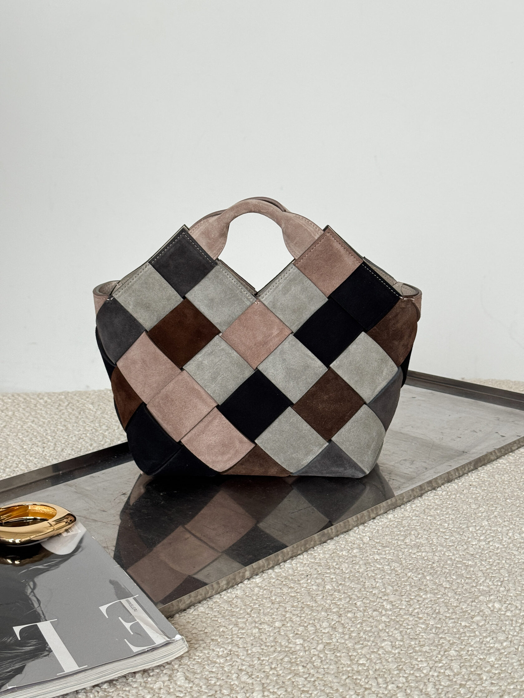 Сумка-корзина в технике ручного плетения из натуральной замши. Закрывается на скрытые магниты, внутри отделение с отделкой подкладочной кожей, в комплекте съемный плечевой ремень.