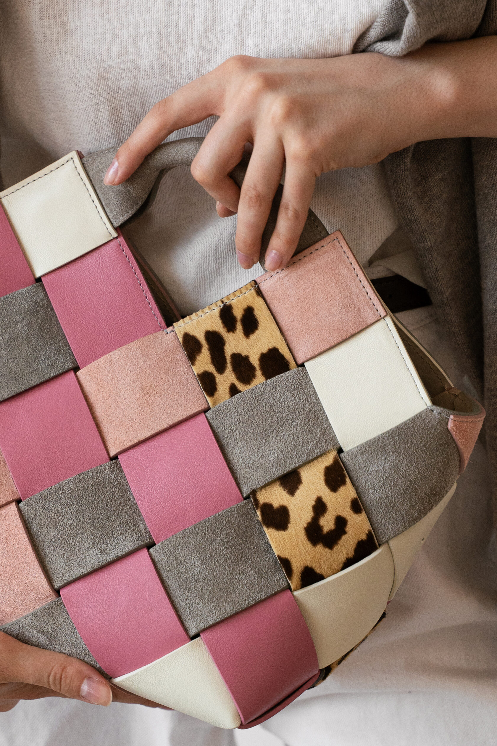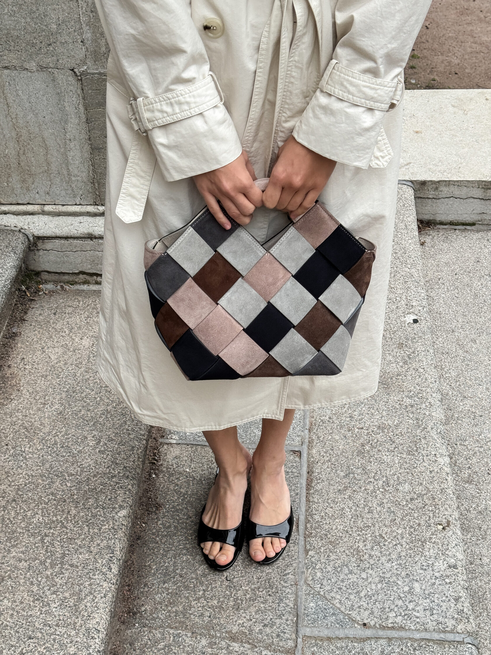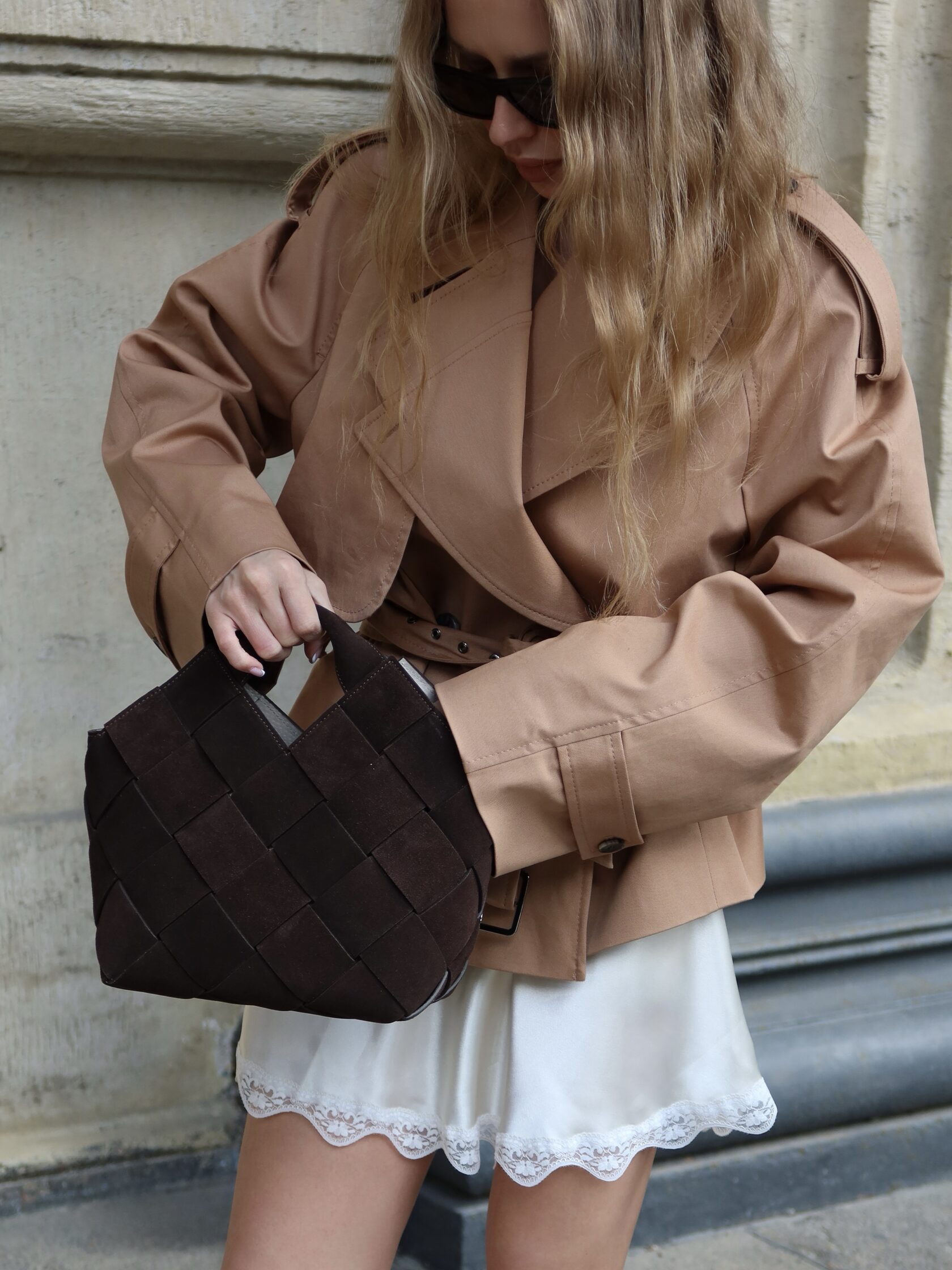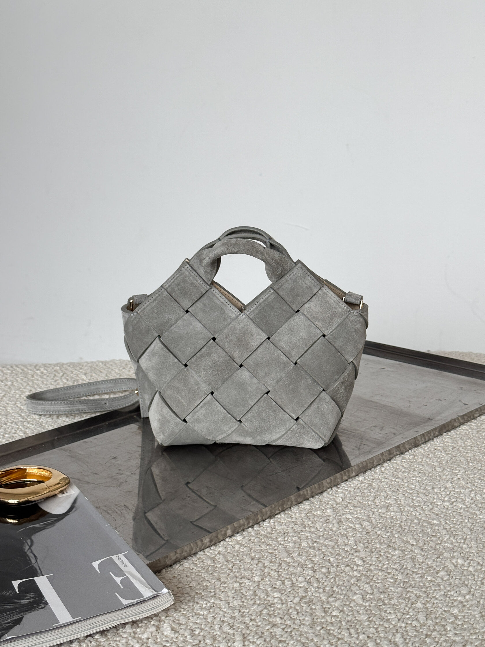 Сумка-корзина в самом маленьком размере. Вмещает телефон, салфетки, портмоне и разные мелочи. Внутри отделение с отделкой натуральной подкладочной кожей, кожаный карман и усиленное дно. Ремень съемный, с возможностью регулировки.