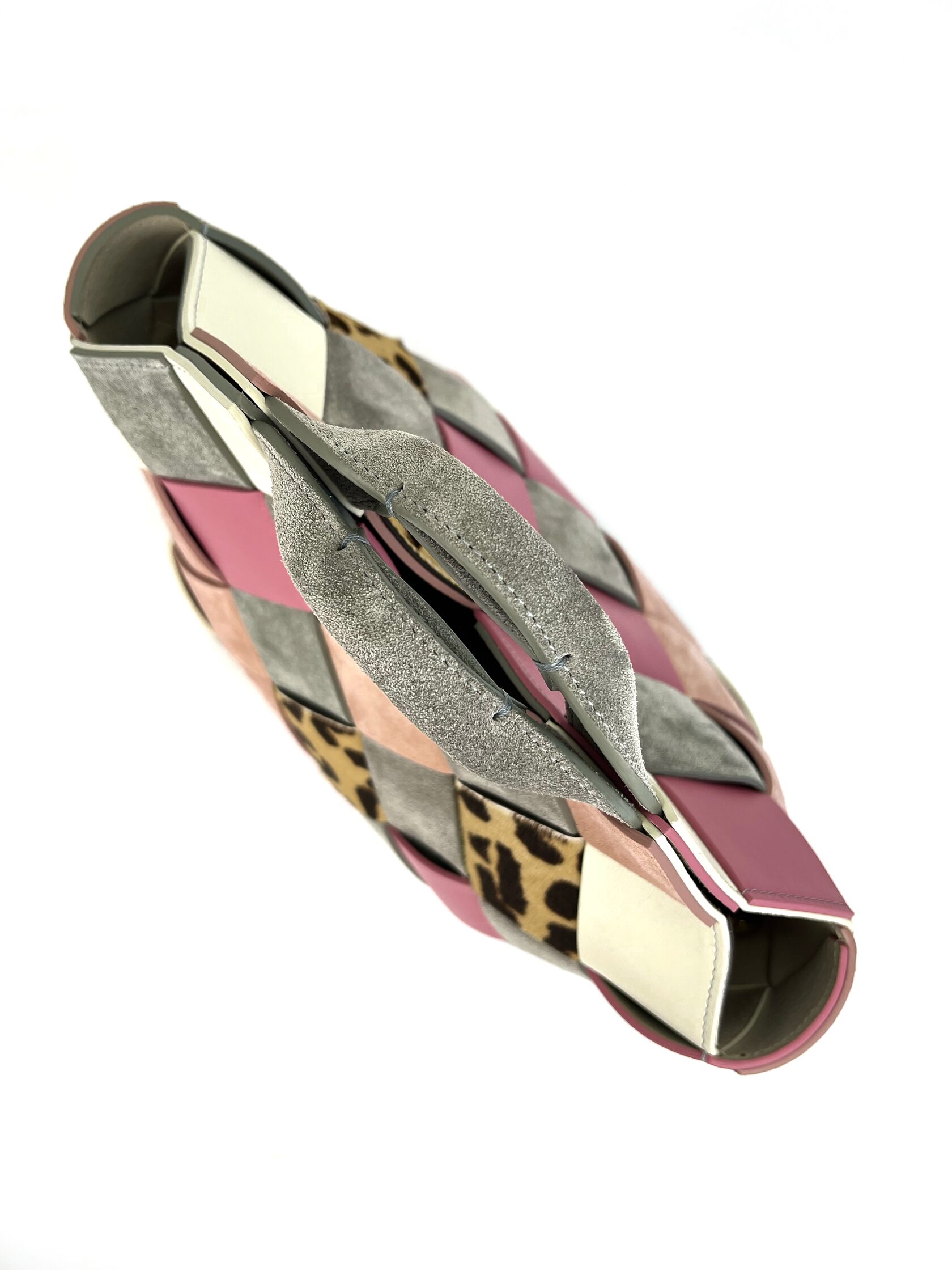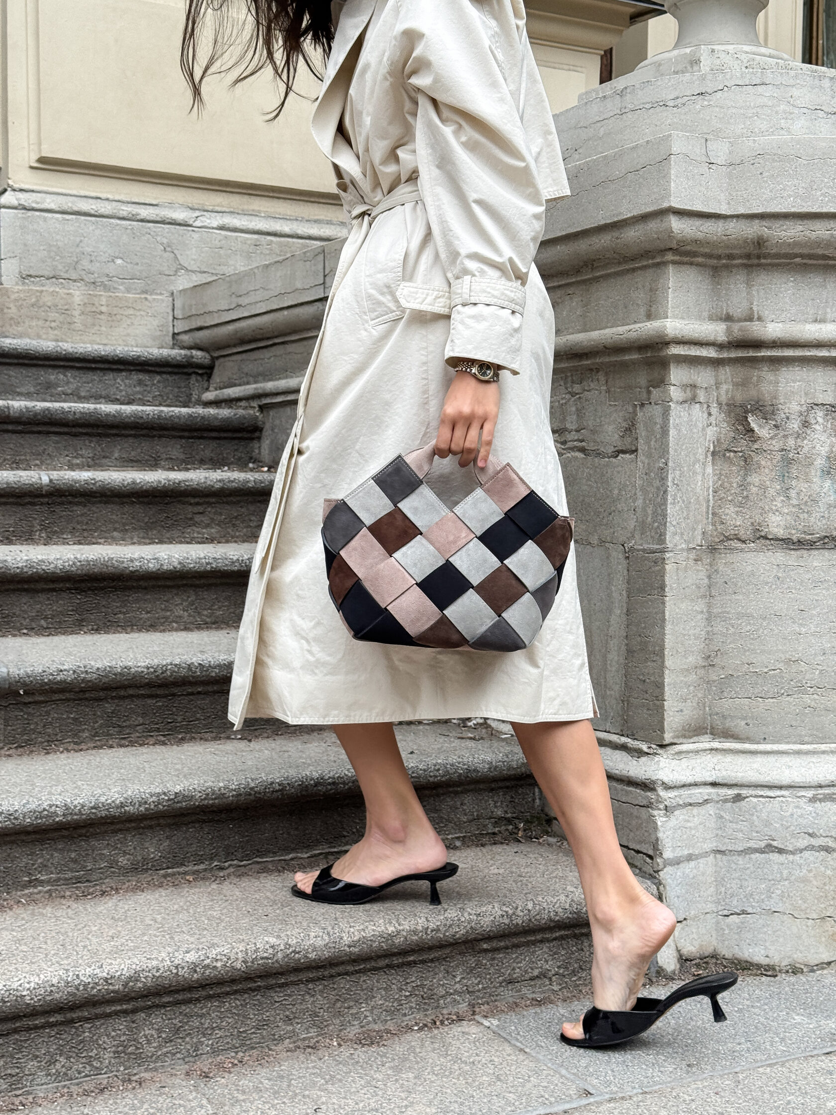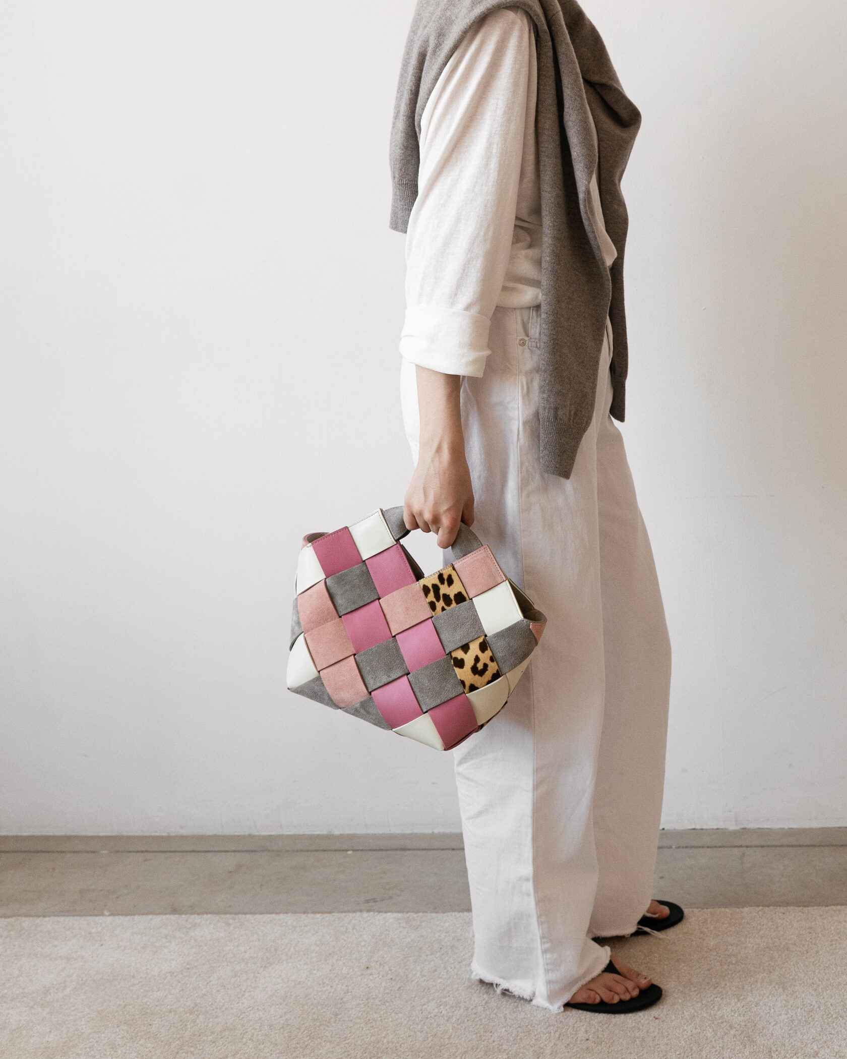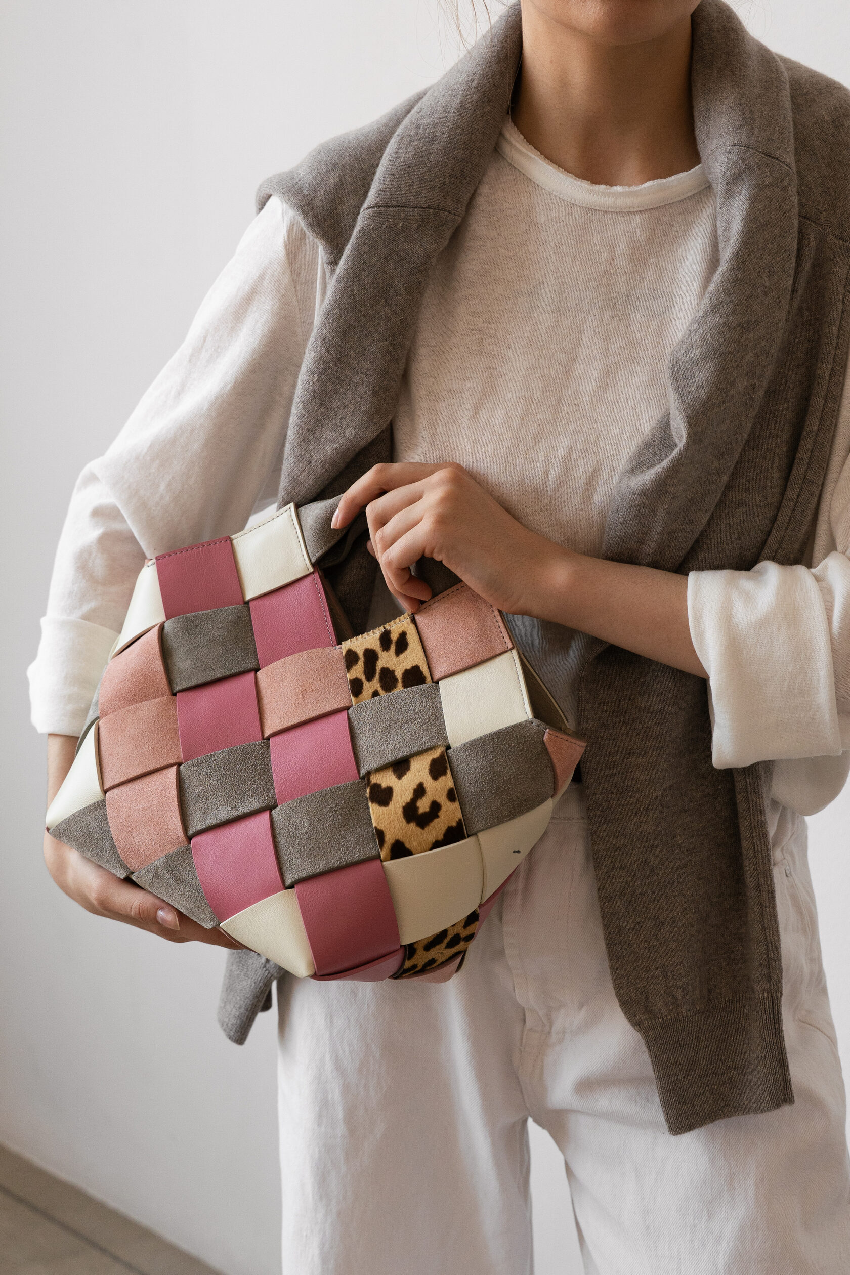 Сумка-корзина в самом маленьком размере. Вмещает телефон, салфетки, портмоне и разные мелочи. Внутри отделение с отделкой натуральной подкладочной кожей, кожаный карман и усиленное дно. Ремень съемный, с возможностью регулировки.