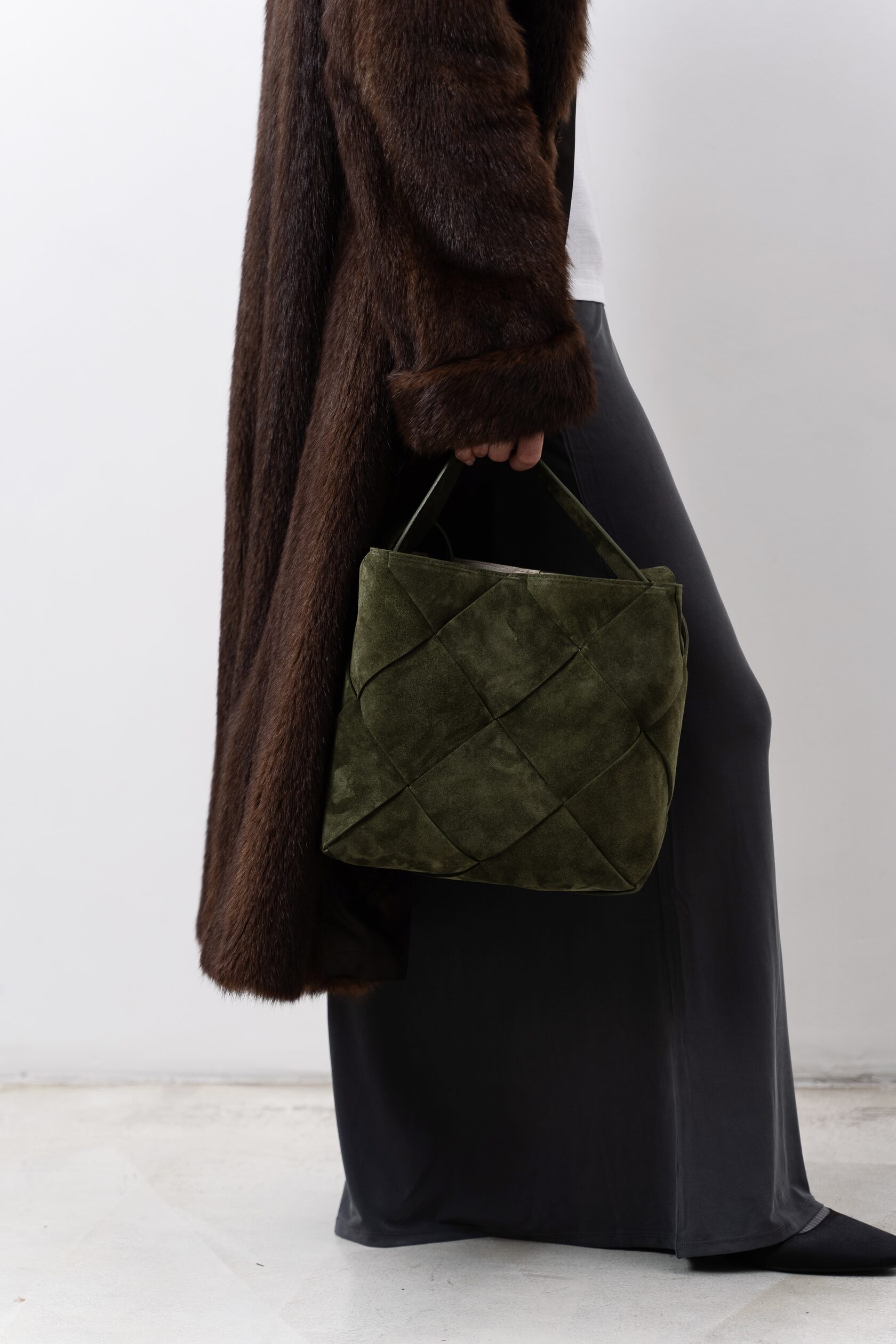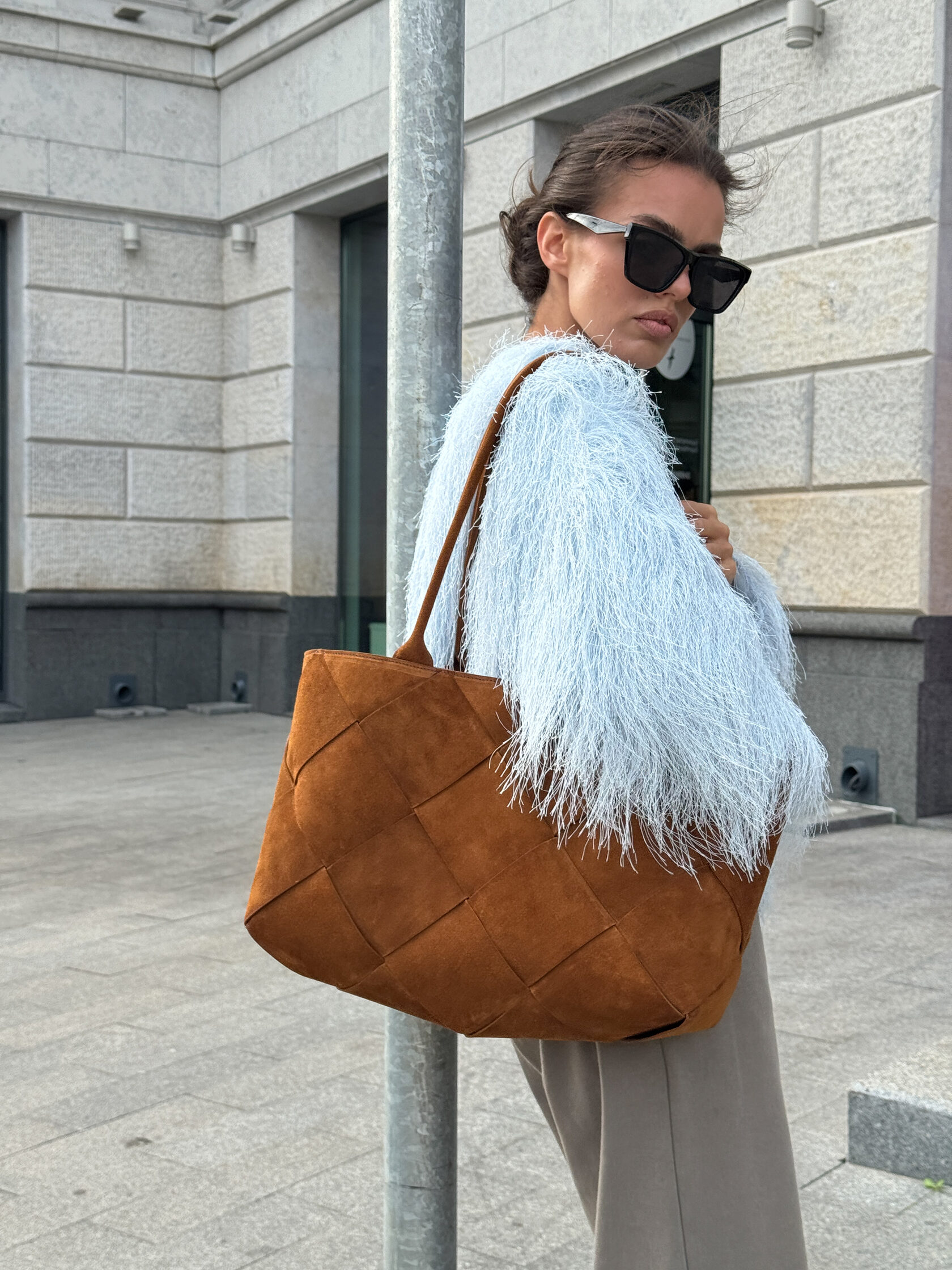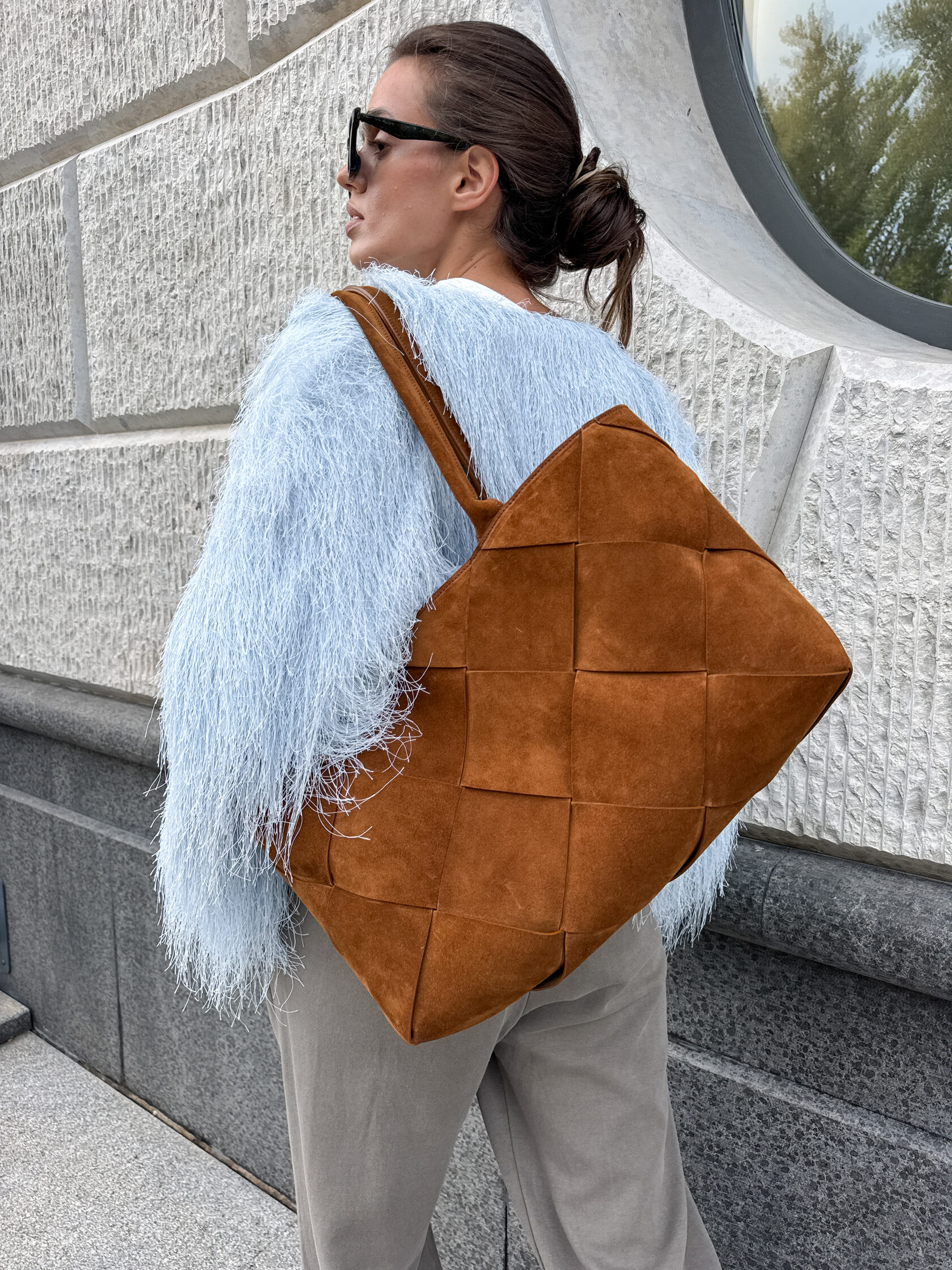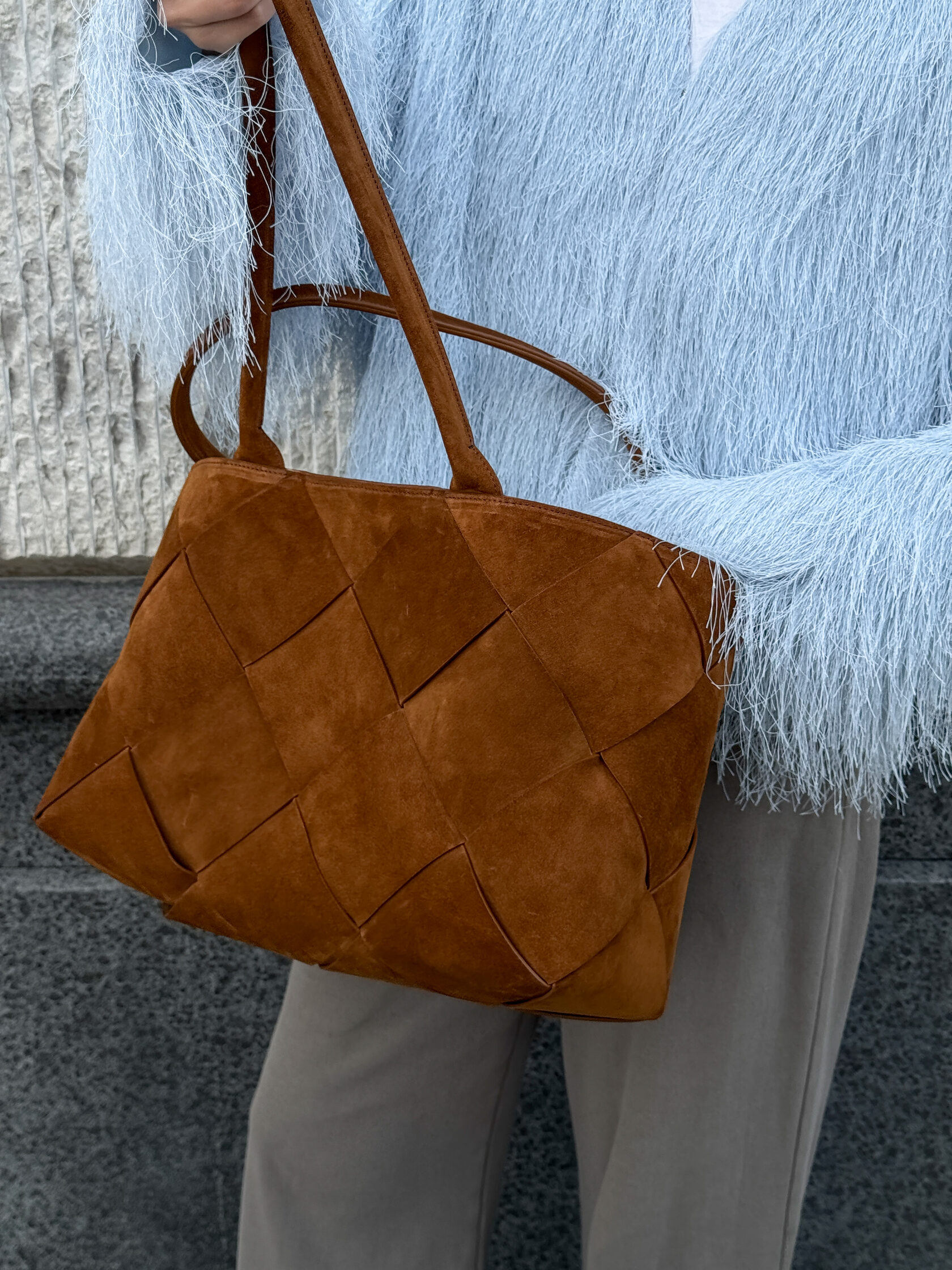 Новая увеличенная версия сумки Belts в технике ручного плетения из натуральной замши. Сумка удобно держится на плече благодаря удлиненным ручкам. Проблема веса крупных изделий решена тканевым подкладом, который облегчает их на 30%.